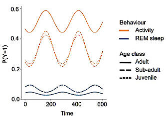 Es wurden Unterschiede zwischen Individuen unterschiedlichen Alters festgestellt, aber keine Unterschiede in Bezug auf das Geschlecht. Bei den meisten Arten nahm der Anteil des Liegens während der Nacht deutlich zu. Außerdem wurde druchgehend ein hohes Maß an Rhythmizität festgestellt.