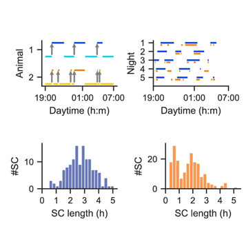 Differences were found between individuals of different ages, but no differences were found in relation to sex. In most species, the proportion of lying down during the night increased significantly. In addition, a high degree of rhythmicity was consistently observed.