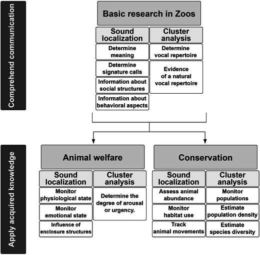 To fully exploit the potential of bioacoustic methods, it is necessary to conduct basic research to understand communication and the meaning of vocalizations. Zoos provide excellent conditions for conducting bioacoustic studies because they keep a relatively large variety of different species with natural behavioural repertoire.