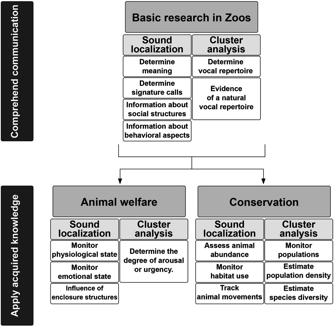 Bioacoustic methods have the potential to contribute considerably to animal welfare and conservation by means of the information contained in animal sounds. Since animal welfare is especially important in zoos, bioacoustic studies offer the opportunity to non-invasively collect data regarding emotional state, sex, subspecies, reproductive status, social status, and stress levels. In the field of ecology and conservation, bioacoustic methods are used, for example, to monitor populations, estimate population densities, or estimate species diversity.